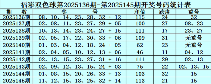 双色球第2025145期奖号开出:11、12、15、18、25、32 + 14,红球号码和值开出113,跨度开出21,开出重号1个:15。蓝球为2路号码。